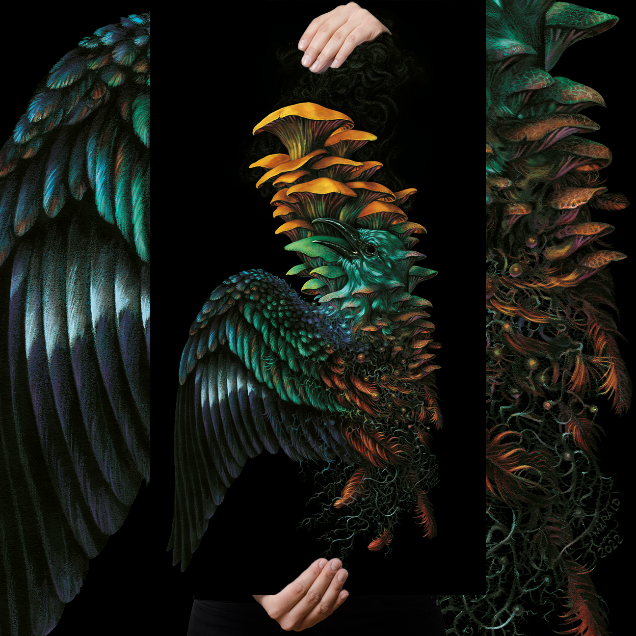 "This piece is part of a diptych*, reflecting on the theme of the previous album “Dreamsquasher” constructing a continuity & natural progress between both albums. The art is based on the concept of the “zombie-fungus” Cordyceps. In this piece the mushrooms have come to fruition & release their spores in “dust” like smoke. Referring to the title & fully showing the duality of life/death.